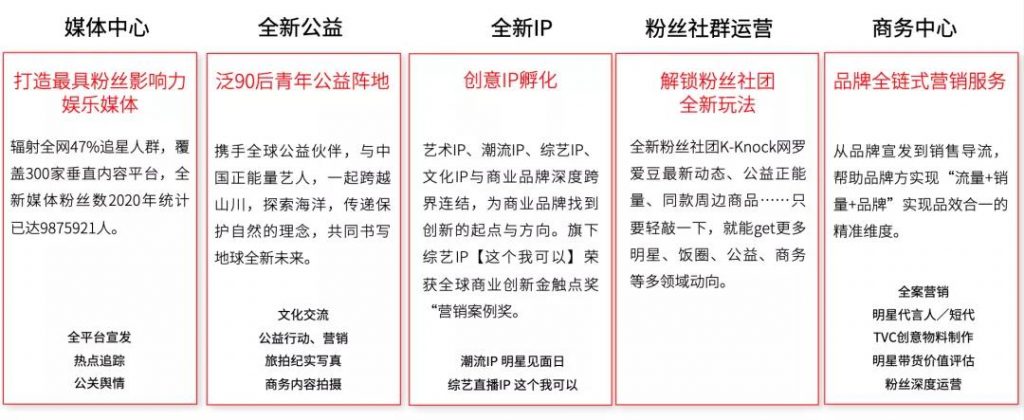 • 商务中心:全新娱乐希望打造全新的“偶像娱乐营销“模式,为品牌提供专业的偶像营销和执行方案;在服务模式上,提出包含宣发、导流、销售的一站式全链条服务,并将销售变现前置,倒推产品设计、创意、传播等环节,帮助品牌方实现品销合一。