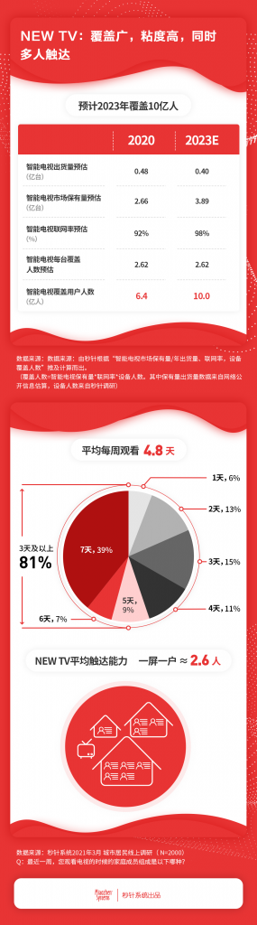 随着电视市场由传统电视向NEW TV变迁,智能电视保有量持续增长,不断提升NEW TV触达广度。根据秒针系统推算,NEW TV在2023年设备保有量将达3.89亿台,每台预估覆盖2.62人,覆盖用户超10亿人。NEW TV强大的触达力、生产力及触动力,将作为优质流量,成为数字时代品牌营销的重要阵地。