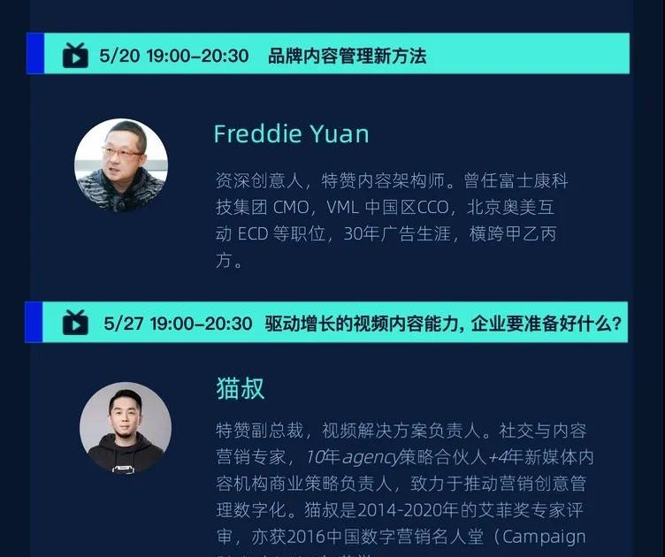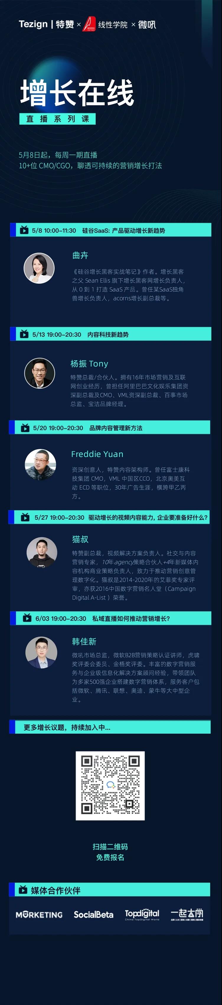 5月8日起,一个月时间,摸清增长的脉路,特赞学院联合线性学院、微吼邀请各行各业的专家或意见领袖,围绕最热门的“增长议题”:内容科技趋势、品牌内容管理方法、视频内容玩法、私域直播新打法等,助力企业构建可持续增长的「新引擎」。