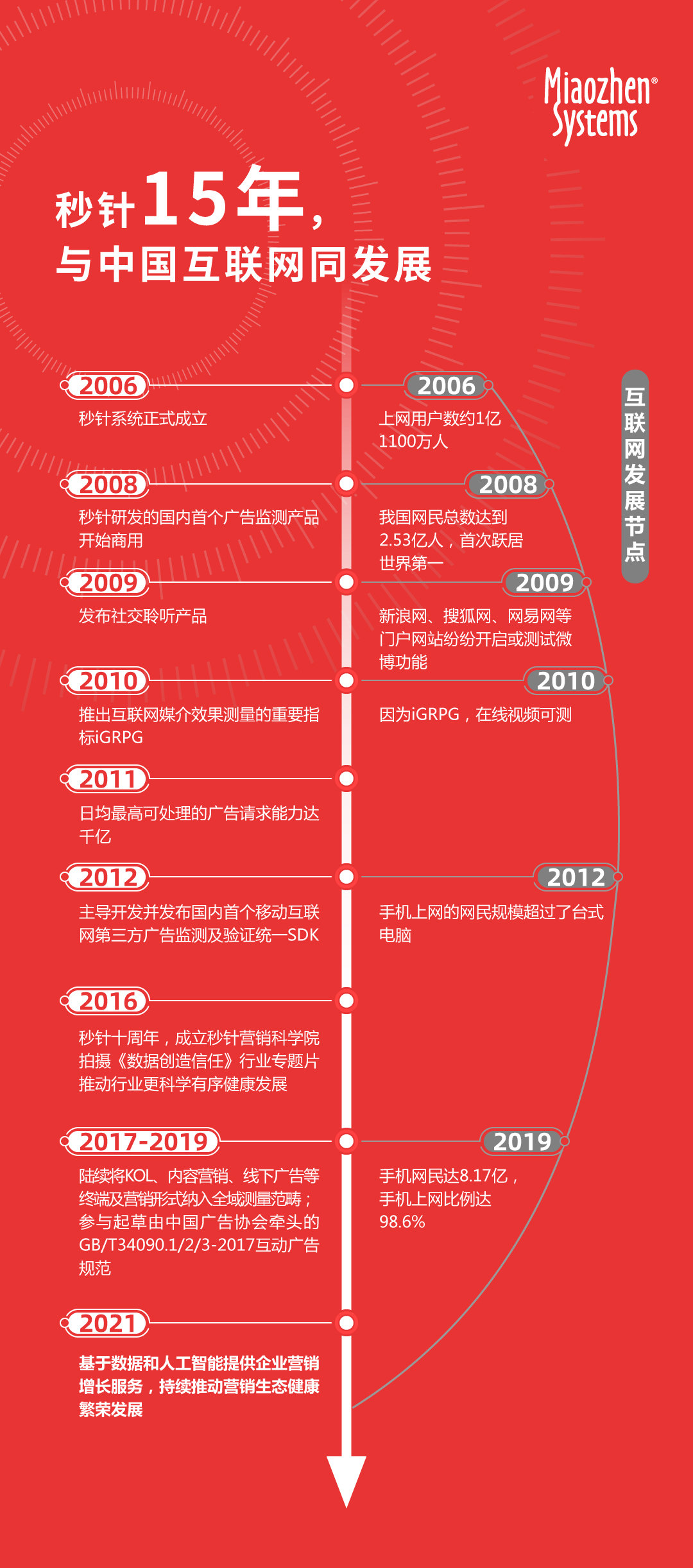 从2006年中国网民数破亿,到2020年网民人数逼近10亿大关,是中国互联网的腾飞的15年,数字经济已经成为中国经济的重要组成部分。这15年,秒针系统也快速成长,见证并投身于中国互联网行业迅猛发展的浪潮。秒针系统以营销科学为基石,逐步建立覆盖全域计划、全域测量、内容智能和智能洞察的全域营销产品矩阵。同时,秒针也积极回馈行业,参与行业标准制定及落地,打造行业知识分享平台,助力中国营销生态健康繁荣发展。