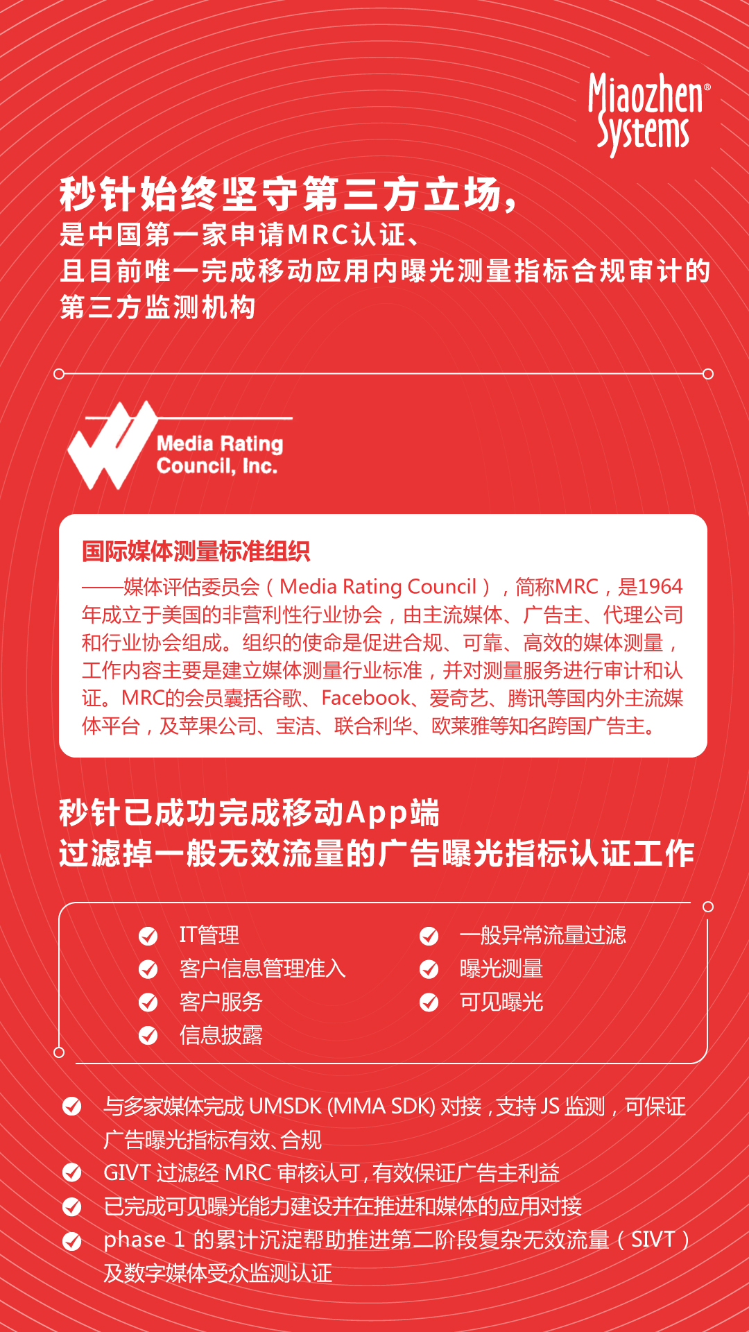 秒针系统始终坚守第三方立场,是中国第一家申请MRC认证、且目前唯一完成移动应用内曝光测量指标合规审计的第三方监测机构