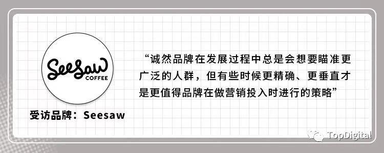 Seesaw:我们身边诸多朋友都在进行不同品类细分领域内的新消费品牌创业,不少也处于咖啡圈。其中在初始期能取得不错商业增长的从业者,普遍都非常擅长利用平台红利,打非常精准的人群圈层。“精准人群”和“垂直圈层”是一直引发我们在进行营销规划时的思考。诚然,品牌在发展过程中总是会想要瞄准更广泛的人群,在设定品牌时,总爱设置非常宽泛的标签和画像,但有时候更精确、更垂直才是更值得品牌在做营销投入时进行的策略考量。一直很认同一句话,“有小众狂欢才有大众围观”,没有品牌是真正的小众品牌,反而一个品牌能变成某一群小众的挚爱,才有可能拥有更大众的市场。