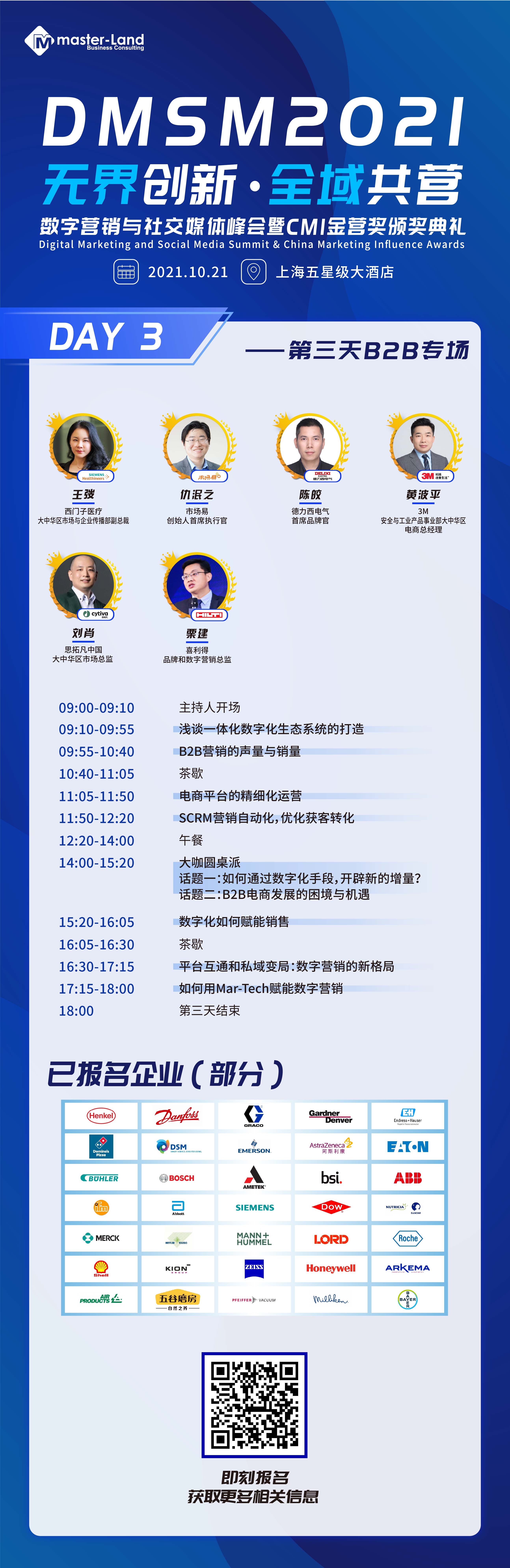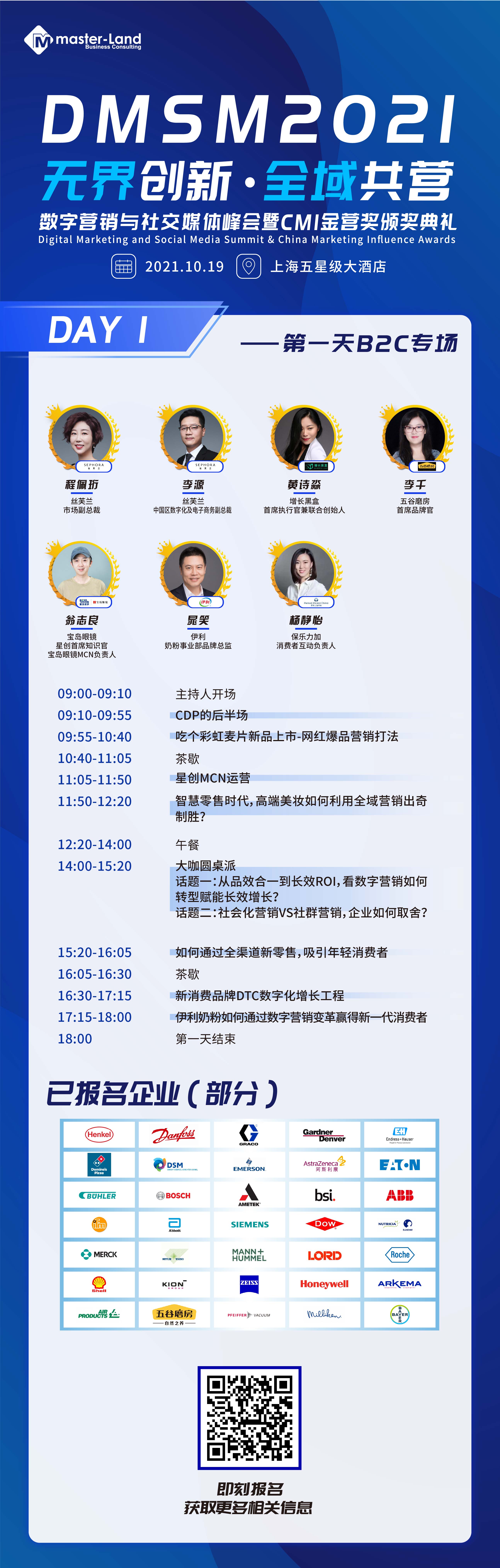 会议邀请到来自B2C领域:丝芙兰/明月眼镜/伊利/五谷磨房/飞利浦;B2B领域:泰克科技/帝斯曼/艾默生/3M 等数十家头部企业数字化转型领袖和营销专家,分享具有战略前瞻性和敏锐洞察力的企业内部最新数字营销策略和方法。
