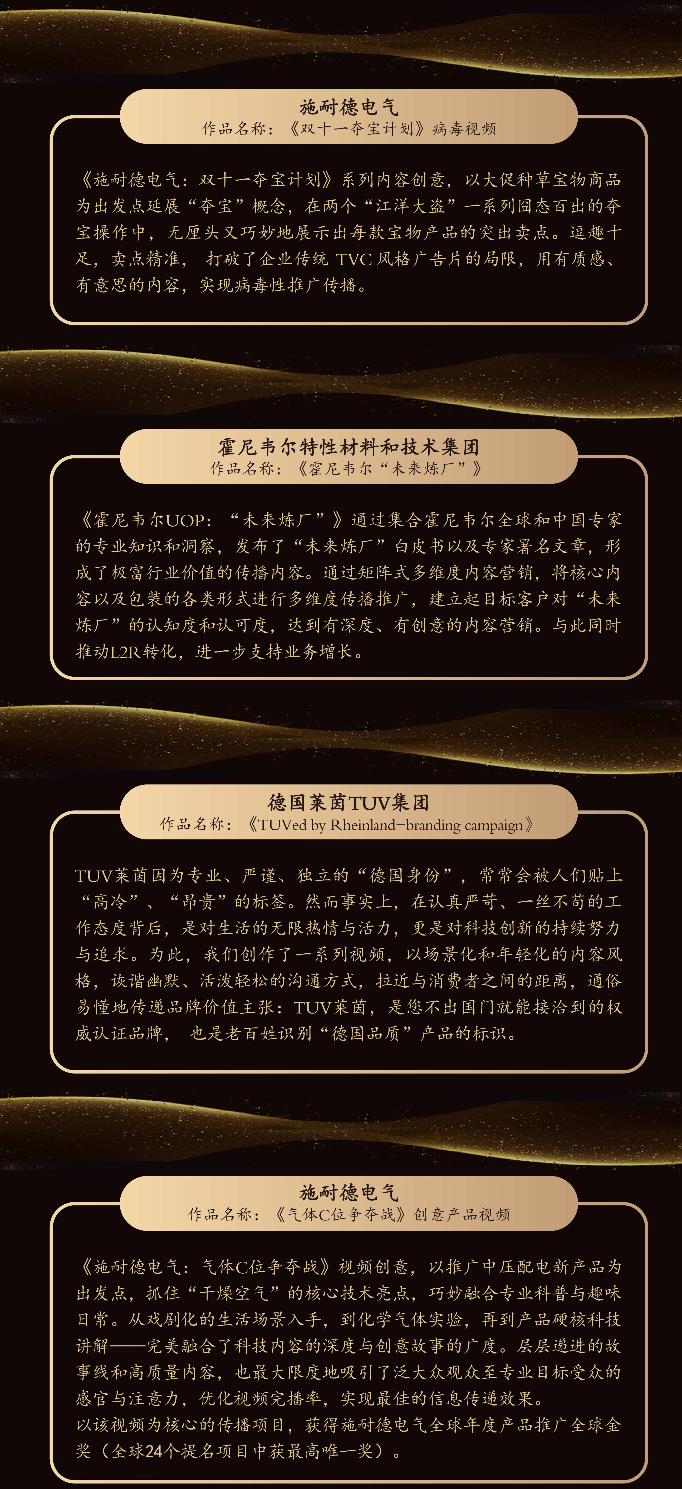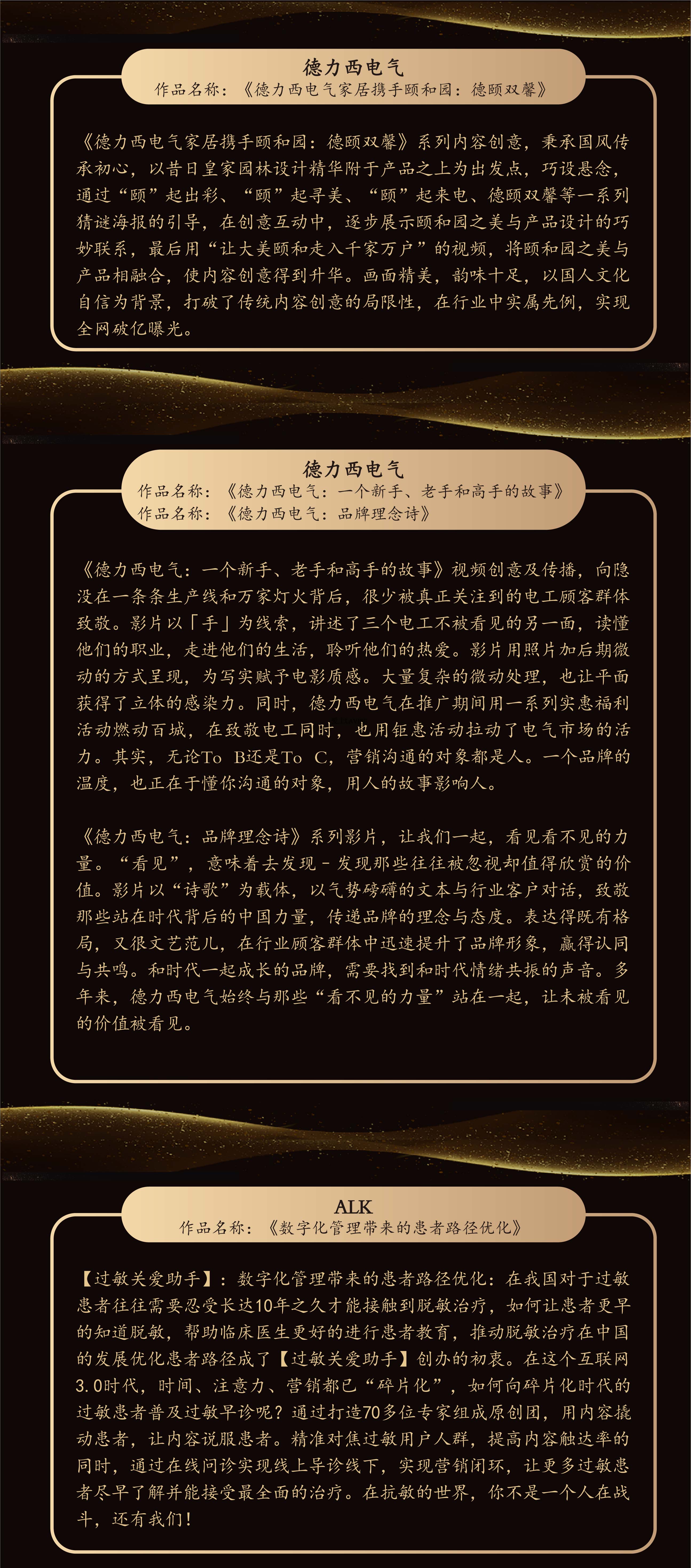 最佳内容营销创新奖:好的内容营销起始于一个好的价值主张(Value Proposition),通过内容的创新,形式的延展去传递并证明价值主张,在此过程中放大客户的情感和社交需求,获取用户对于品牌、产品和解决方案的认知与认可,并最终实现商业转化的营销过程。