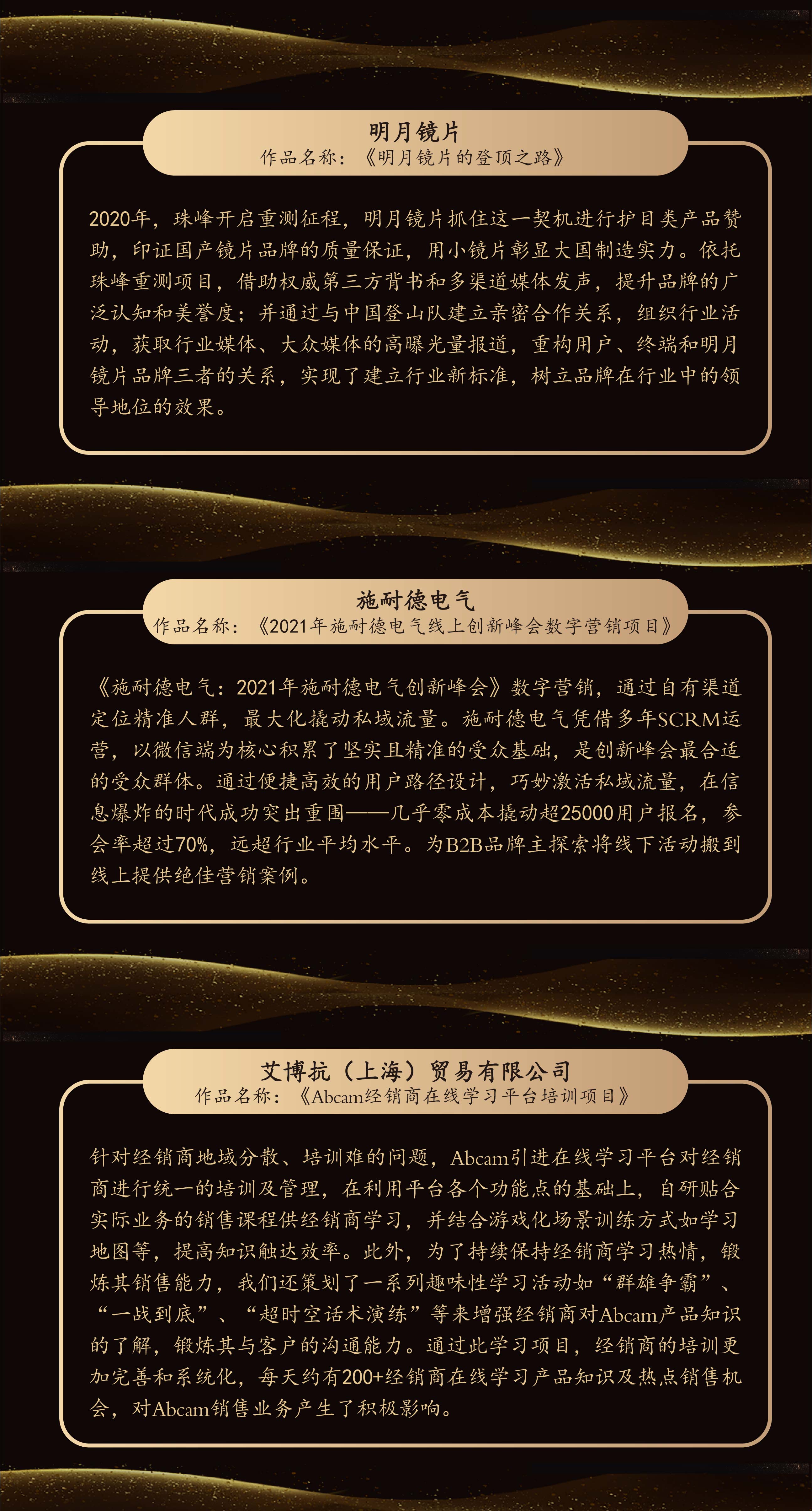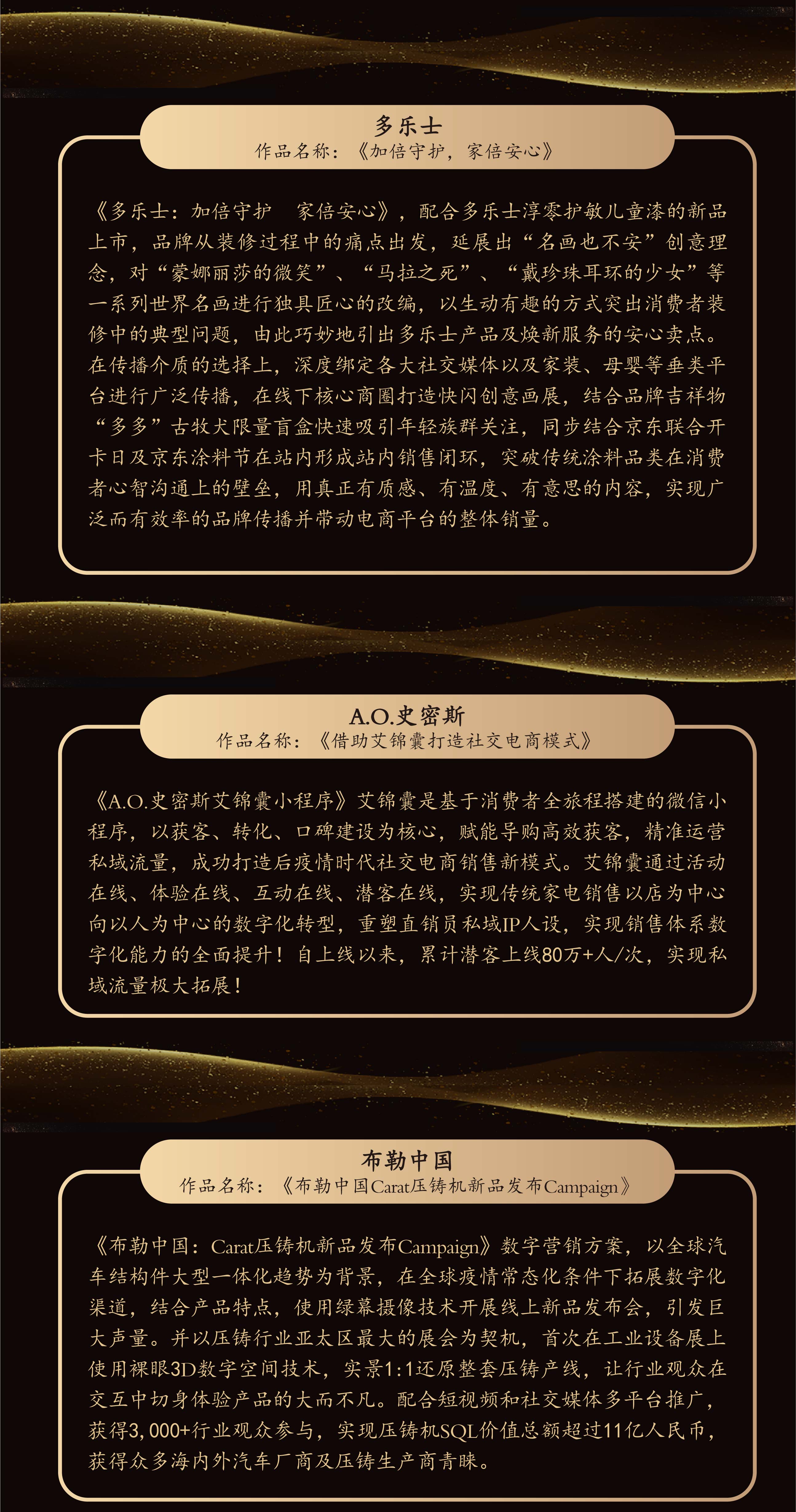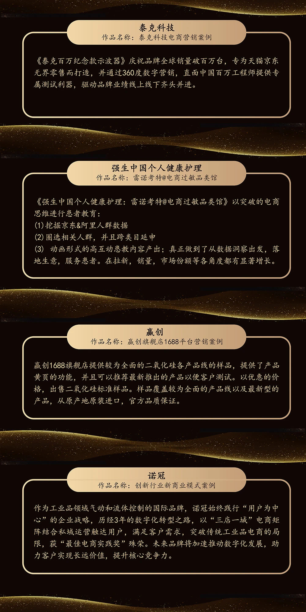 最佳电商实践奖:须清晰阐述电商在公司的定位与价值,协同电商平台的力量,通过电商最佳实践(引流、转化、提升客单价、增加客户粘性-复购率等),带来可衡量的短期(销售额,精准POS)与长期(新客户,客户终生价值CLV)的商业结果。