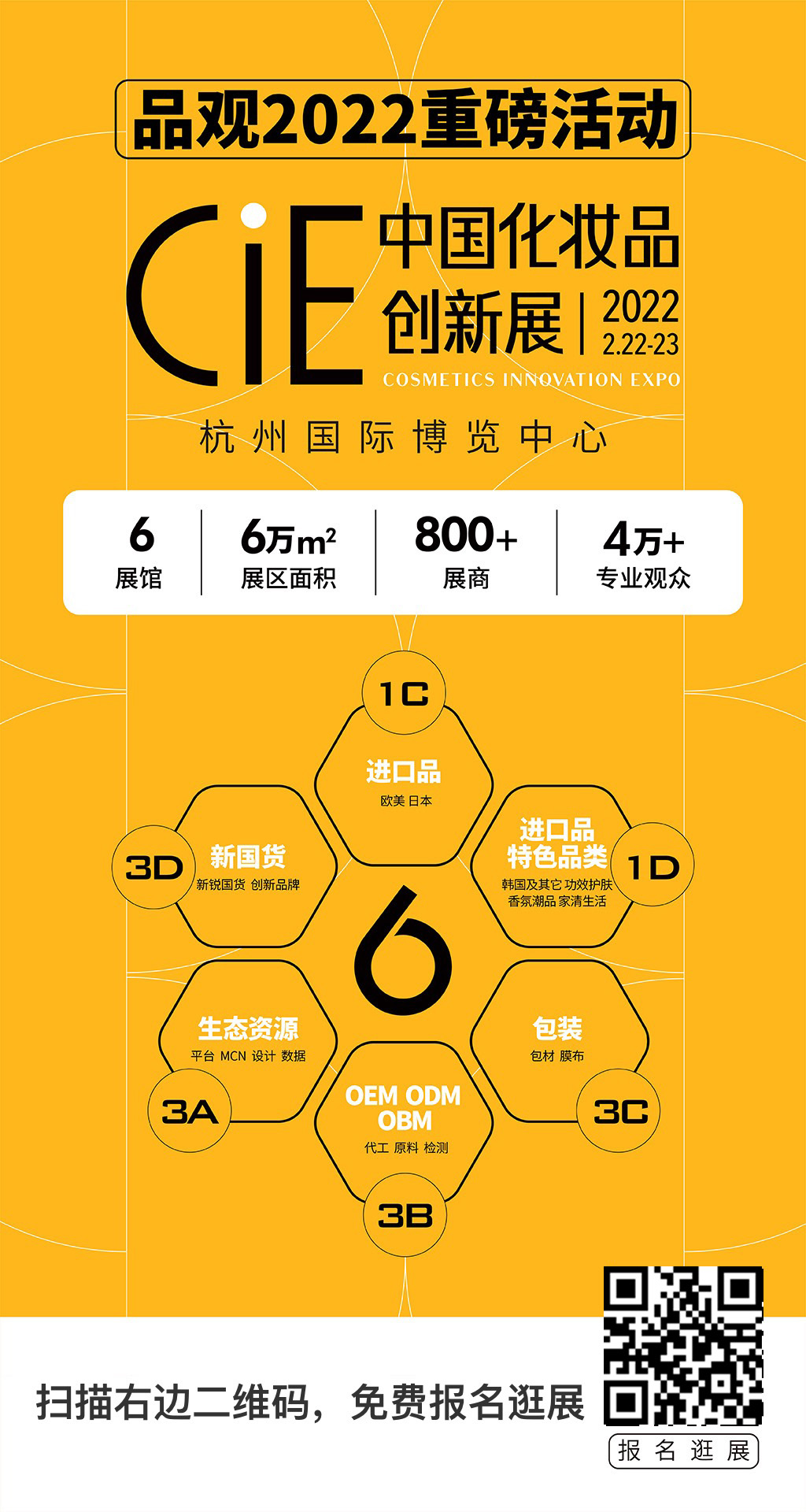 该活动为2022年化妆品行业首场大型美妆展,将于2022年2月22日-23日在杭州国际博览中心开幕,设置了6大展馆,展出面积达6万㎡,预计专业观众超过4万人,全产业链新资源一网打尽,欢迎一聚。