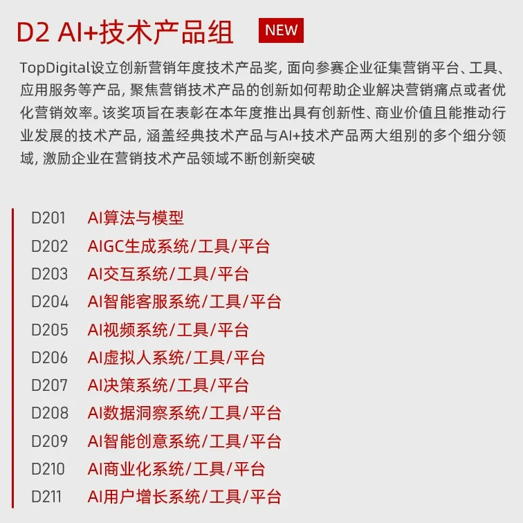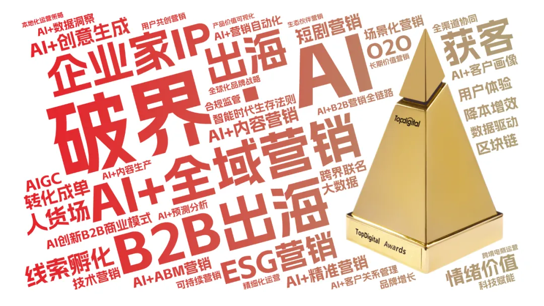 2025第十三届TopDigital创新营销奖围绕“破界·AI”主题,以前瞻视角锚定AI与营销深度融合的黄金赛道!在二级赛道特别设置”AI+”相关奖项,聚焦AI技术在营销产业链上应用的创新与突破。既关注AI对传统营销环节的赋能,比如在人群洞察、营销自动化、智能客服、AIGC生成等成熟赛道的升级实践;更开辟”未来实验室”,聚焦AI虚拟人等前沿领域,寻找颠覆行业认知的突破性探索。TopDigital创新营销奖既为成熟应用提供权威认证,更为未来趋势搭建预演舞台。