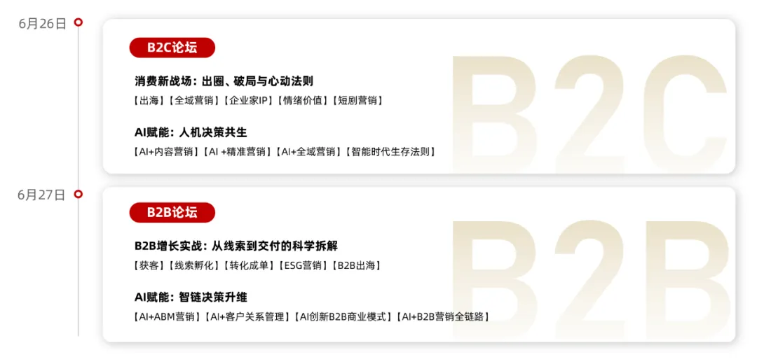B2C论坛:聚焦「消费新战场」,从跨境出圈到短剧破局,深度解码消费者的“心动法则”;开启「人机决策共生」实验,揭示AI如何从数据分析者进化为消费决策的共谋者。