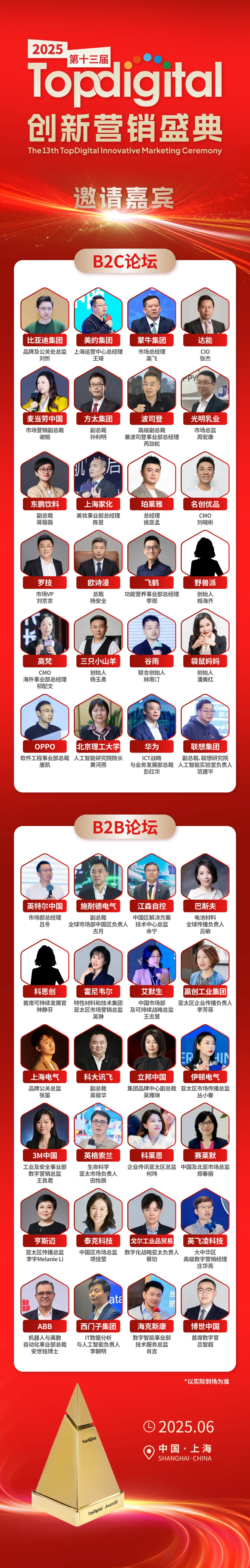 今年的TopDigital创新营销盛典将紧扣“破界·AI”主题,以更高标准精心打造嘉宾阵容,汇聚品牌、渠道、投资、学术等多领域的顶尖人物。我们邀请到超过80%的全球五百强企业高管、新消费品牌创始人,以及在AI与商业融合领域极具影响力的专家学者。他们将围绕“破界·AI”核心议题,展开累计9小时的深度对话与智慧碰撞,分享如何在AI时代打破传统边界,重塑品牌增长路径。以下为部分拟邀嘉宾名单: