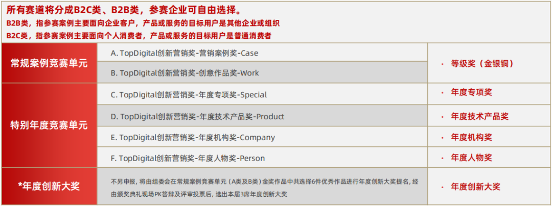 B2B营销正面临着数字化、智能化、社交化、全球化等多种挑战。为进一步创新B2B营销方法论,2025第十三届TopDigital创新营销奖独创”B2B、B2C双轨制赛道矩阵”,依据参赛案例面向企业客户或个人消费者,参赛企业可以自由选择参与B2B类、B2C类,组委员将依据更专业的评审体系搭建营销创新的全景坐标,见证”技术+场景”的深度碰撞。