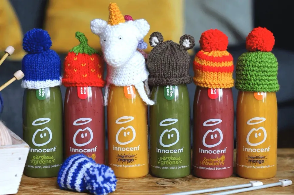 Innocent Drinks 于 1998 年由三位剑桥大学毕业生怀着 “做自己想喝的健康果汁” 的初心创立,如今已成为英国健康果汁市场的领导者。品牌主打天然成分与环保理念,产品涵盖鲜打原果、NFC 果汁等系列,在英国思慕雪市场占据 75% 的份额。面对英国老龄化加剧以及冬季老人取暖的困境,2003 年品牌发起了 “Big Knit”(大编织)活动,将公益与营销相结合,不仅旨在通过创意互动强化品牌 “温暖” 形象,更积极传递可持续的社会责任 。