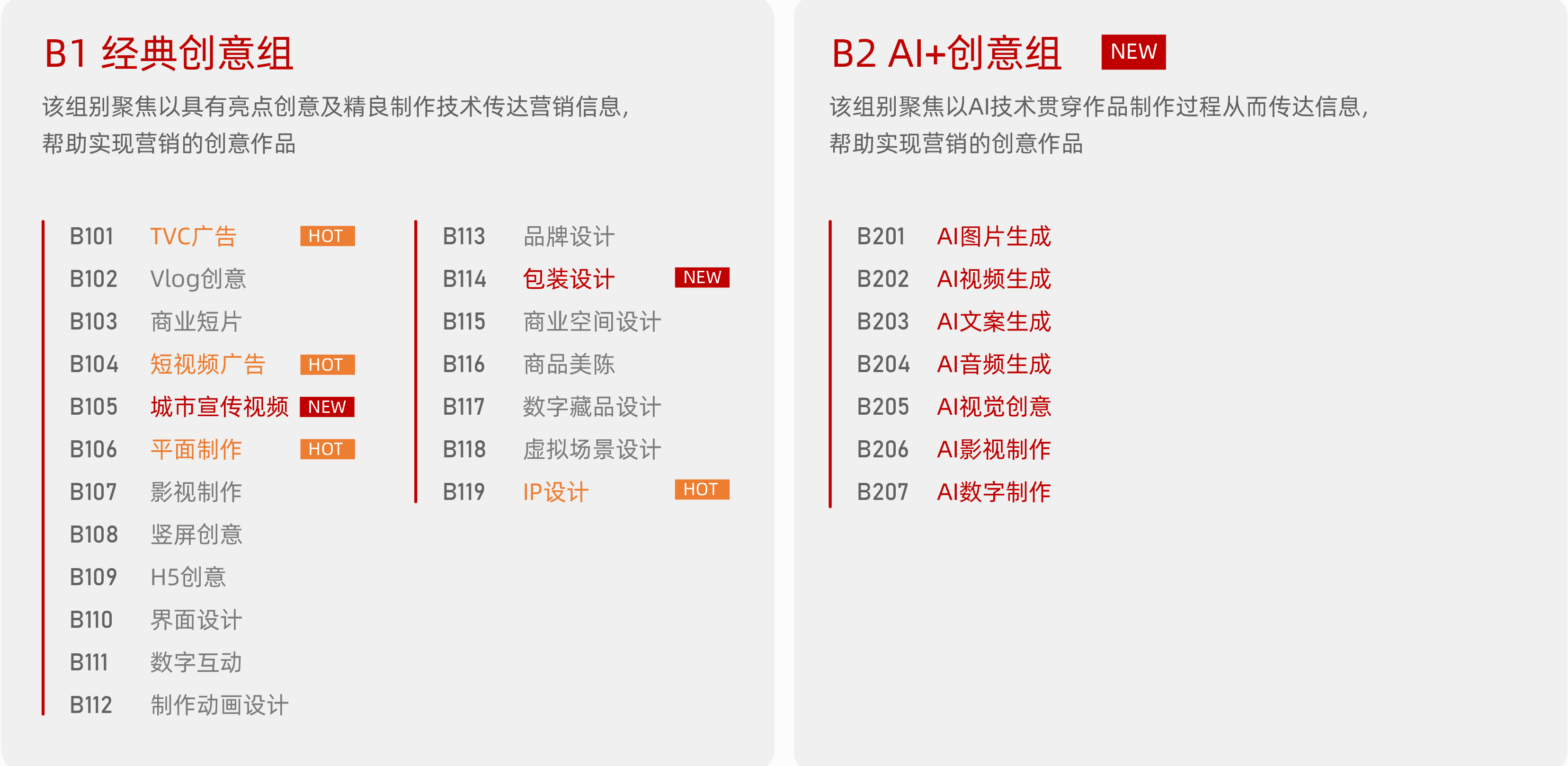 创意作品奖下设为2个二级赛道:B1-经典创意组聚焦以具有亮点创意及精良制作技术传达营销信息,新增【城市宣传视频】【包装设计】三级赛道,符合要求的城市文化、风景和特色的宣传片或设计产品包装类案例可参与申报,而【TVC广告】【短视频广告】【IP设计】等三级赛道均是申报的大热赛道;B2-AI+创意组为本届赛事新增二级赛道,该组别聚焦以AI技术贯穿作品制作过程从而传达信息,帮助实现营销的创意作品。