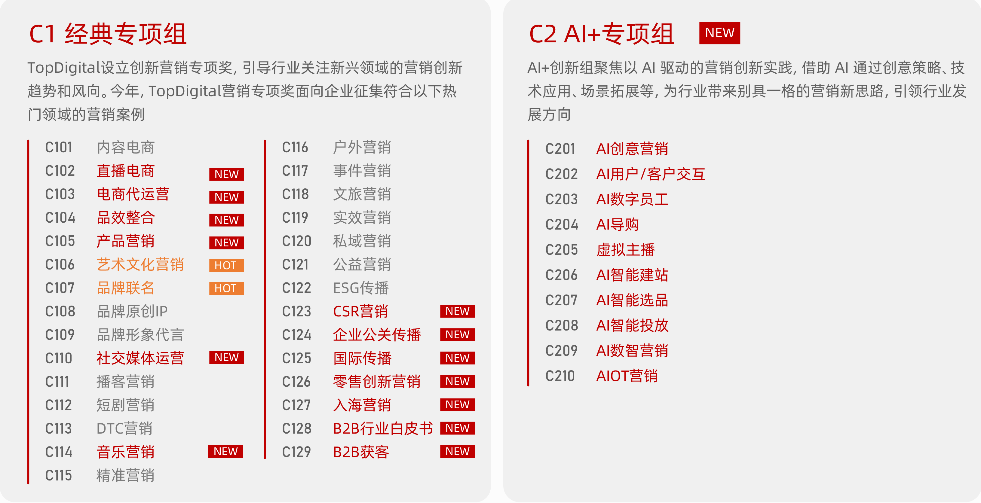 年度专项奖下设为2个二级赛道:C1-经典专项组引导行业关注新兴领域的营销创新趋势和风向,新增【直播电商】【电商代运营】【品销整合】【产品营销】等13个三级赛道,更加关注直播电商赛道,无论是单场破亿的超级直播间、垂类赛道的黑马主播,还是全域流量操盘手,只要能用内容重构消费场景、用数据创造品效奇迹,这里就是你的黄金档!此外,【艺术文化营销】【品牌联名】均是本类奖项申报的大热赛道,见证过不少优秀案例的诞生;C2-AI+专项组为本届赛事新增二级赛道,聚焦以 AI 驱动的营销创新实践,借助 AI 通过创意策略、技术应用、场景拓展等,为行业带来别具一格的营销新思路,引领行业发展方向。
