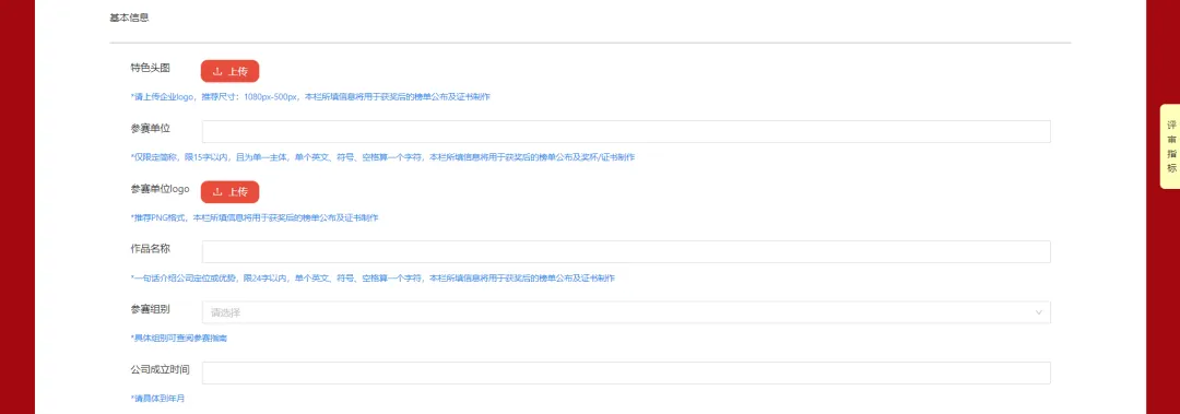 - 参赛单位logo需上传高清透明底PNG文件,所申报的参赛组别、公司成立时间等基本信息也要仔细填写,以便获奖后用于榜单公布及奖杯/证书制作。