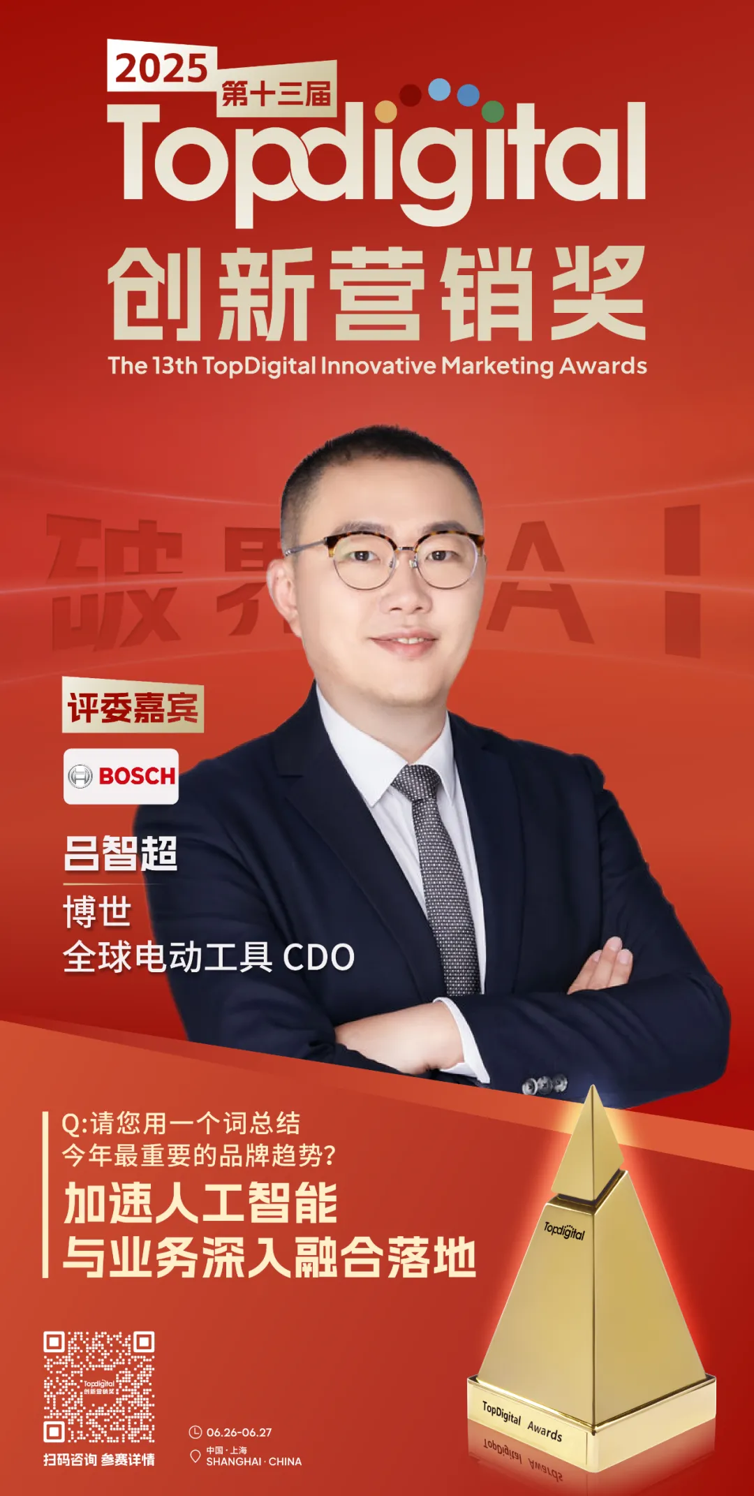 此次TopDigital非常荣幸邀请到博世全球电动工具CDO吕智超加入专家评审团,与我们共同见证品牌典范、杰出产品、精彩案例以及优秀服务机构的诞生。