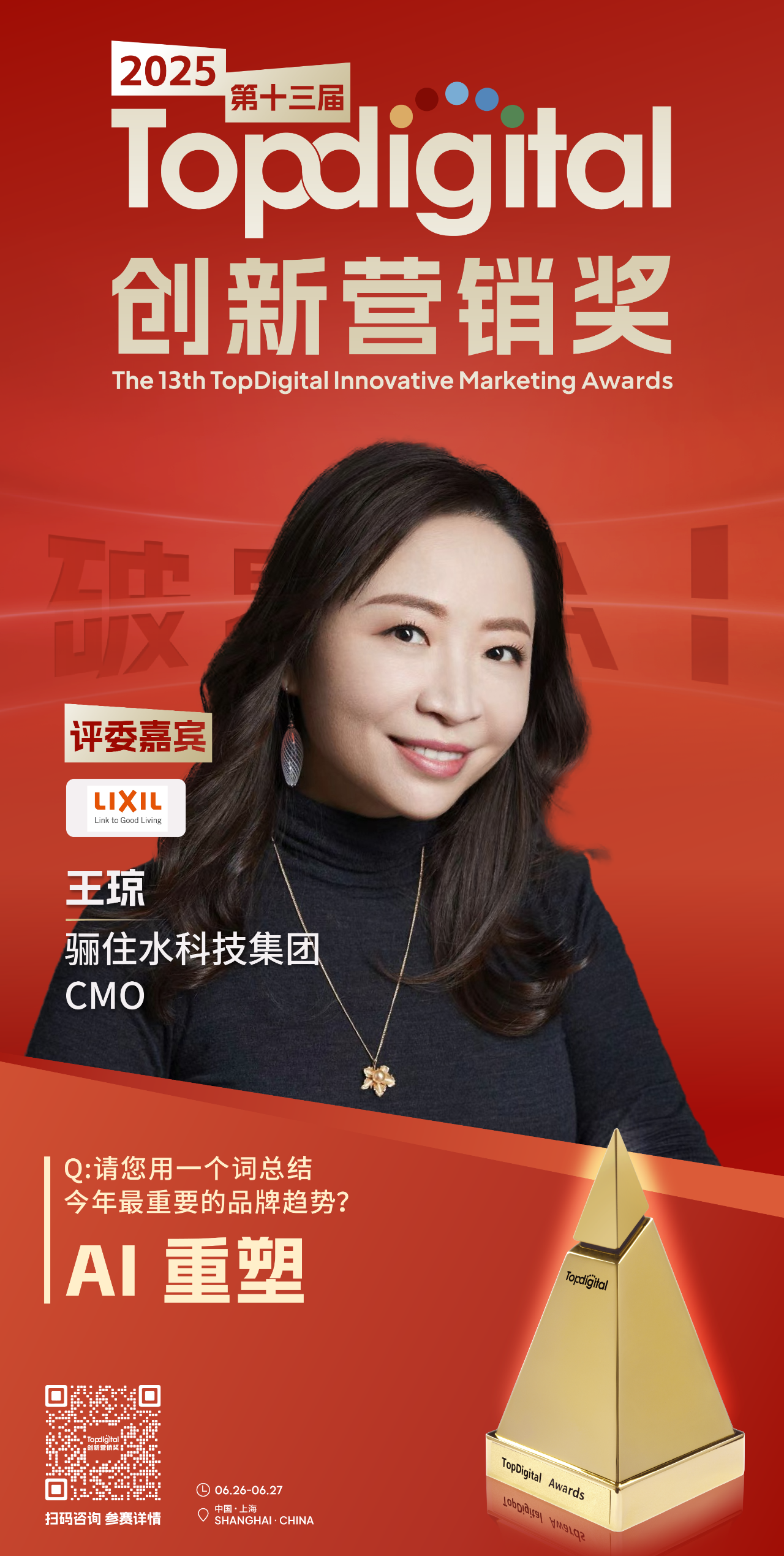 此次TopDigital非常荣幸邀请到骊住水科技集团CMO王琼加入专家评审团,与我们共同见证品牌典范、杰出产品、精彩案例以及优秀服务机构的诞生。