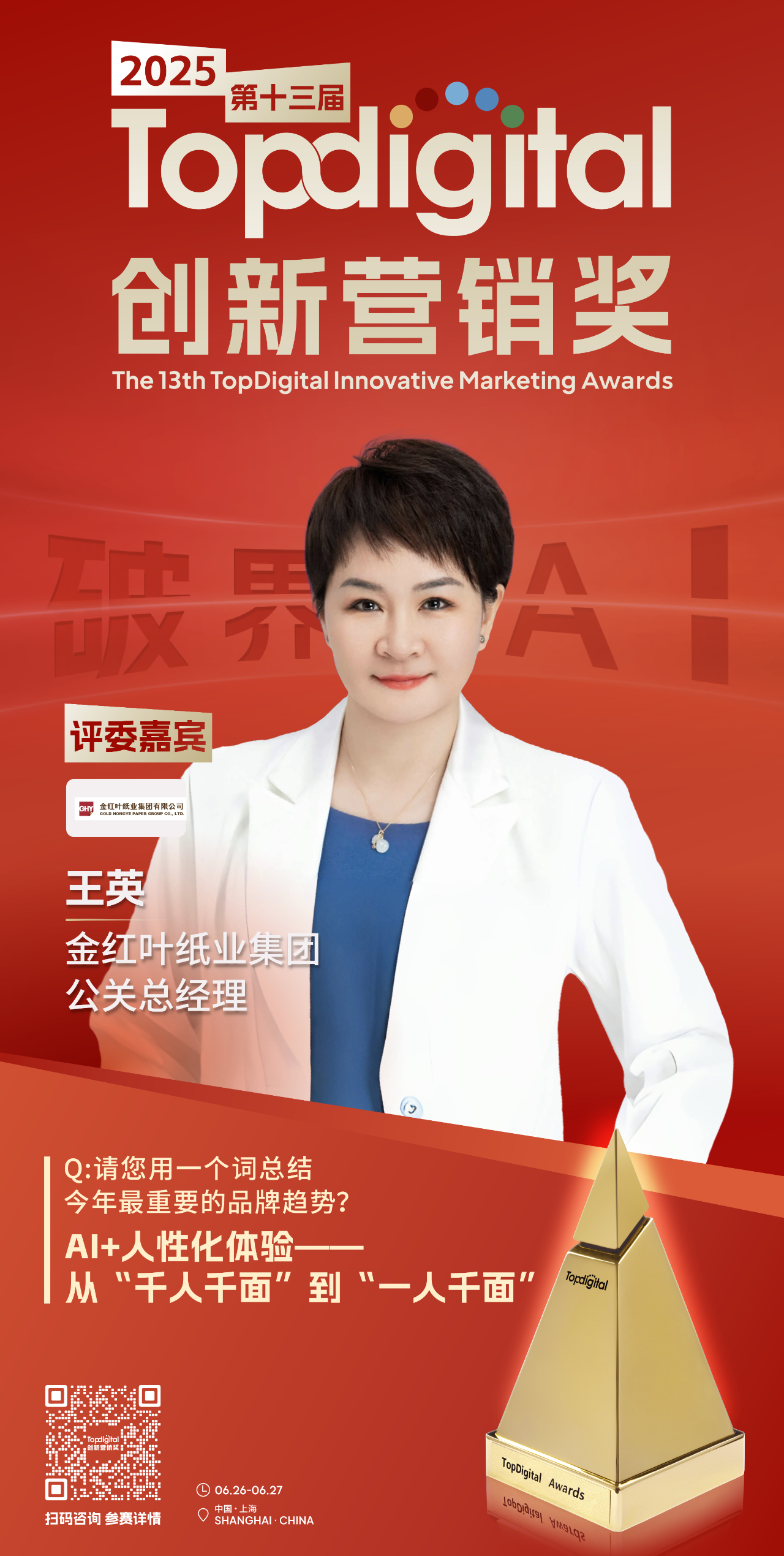 此次TopDigital非常荣幸邀请到金红叶纸业集团公关总经理王英加入专家评审团,与我们共同见证品牌典范、杰出产品、精彩案例以及优秀服务机构的诞生。