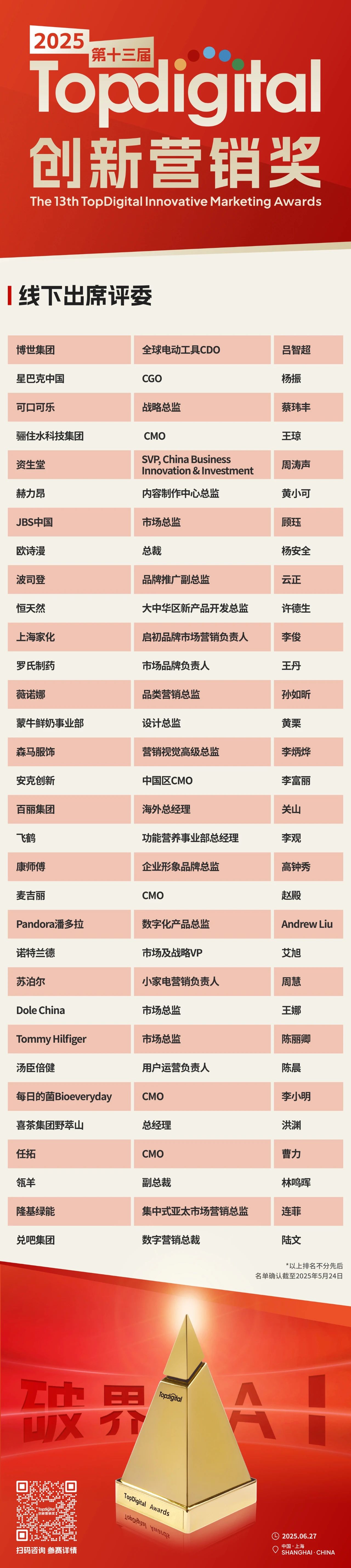 最终奖项将花落谁家?最终参与现场PK大奖的神秘企业到底是谁?完整获奖名单与后续更多精彩,敬请关注将于6月27日在上海举办的2025第十三届TopDigital创新营销盛典!
