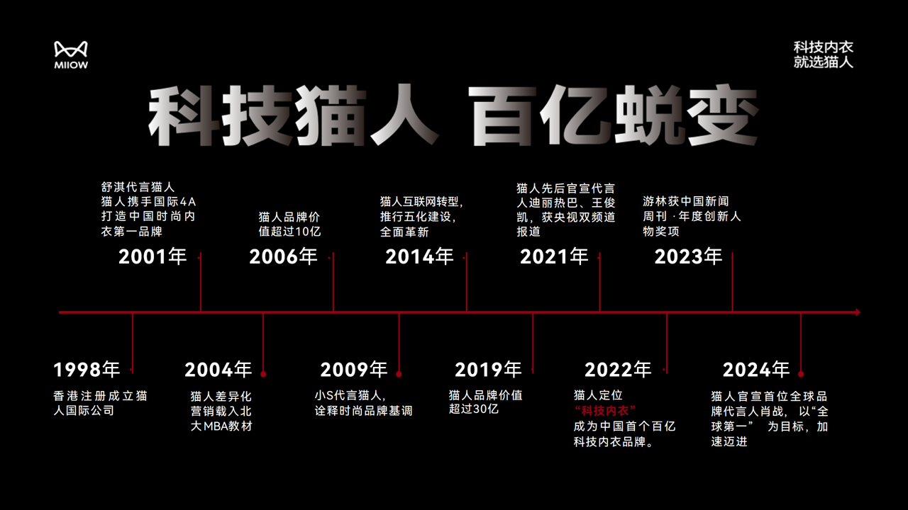 猫人成立于1998年,走27年风雨征程,终于实现中国科技内衣第一品牌的目标。我们当前正在朝着成为全球第一、用户首选的高科技内衣品牌飞速迈进