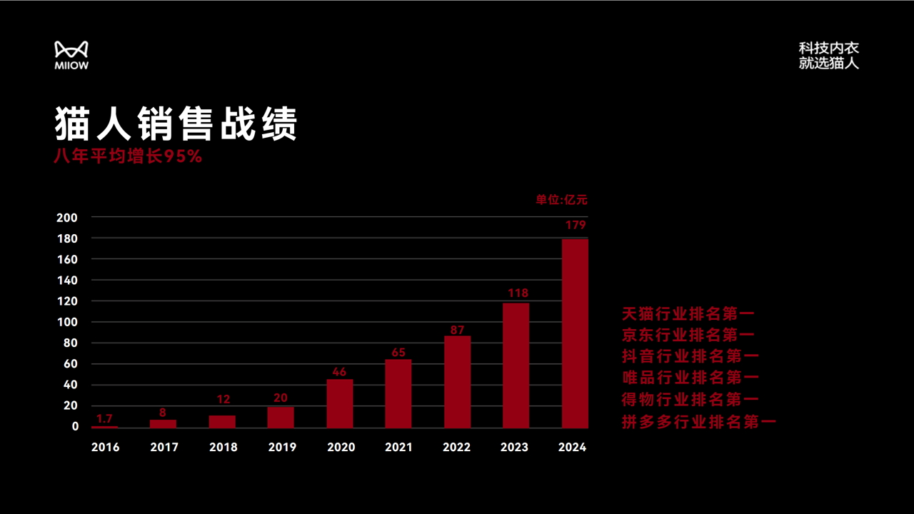 2016年开始,猫人销售规模基本保持着每年100%的井喷式发展2019年我们的销售额才20亿,2020年销售额已经到46亿,后面翻番到65亿、87亿、118亿,一直到2024年179亿,直到今年2025年,我们目前同比增长依然保持着超过50%的增这样的增长趋势引领了整个行业大盘6月新华社发布的全球线上品牌500强,猫人集团成为唯一一个在内衣品牌夺冠的中国国民品牌。