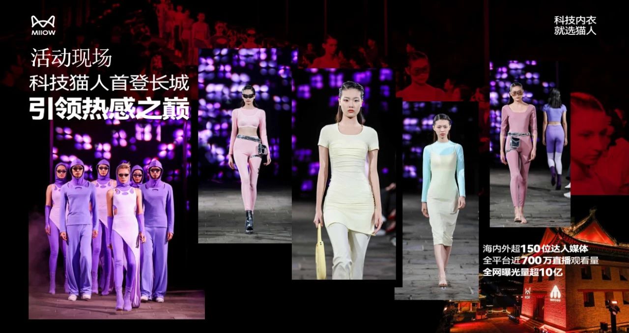 去年年底,猫人在中国长城居庸关成功举办时尚大秀,这是在服装领域举办的超级大秀。大秀不仅吸引越南、泰国等多国的KOL、KOC亲临现场,品牌旗下多位代言人也悉数到场,贾乃亮、宋威龙等明星嘉宾的助阵,更将活动热度推向高潮。内衣要想时尚化还是比较难的,大家想象一下,一件内衣,不管是内裤还是文胸,要设计得特别张扬,好像不太生活。所以我们两手抓,既要让时尚的元素能够在产品上有更多的赋能,又能够让这些衣服穿出时尚感。